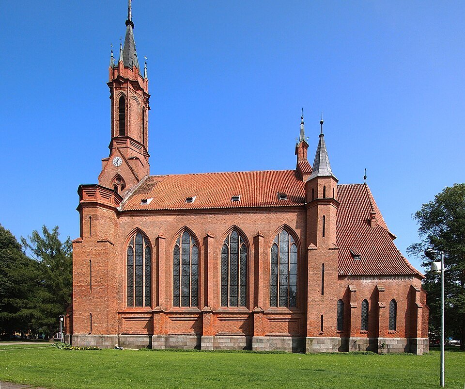 *The Church of Our Lady of the Scapular in Druskininkai is a Roman Catholic church located in Druskininkai, designed by Stefan Szyller in the neo-Gothic style, built between 1912 and 1931. Inside are paintings: “Our Lady with Child and St. John the Baptist” from around 1600, which comes from the Carmelite church in Grodno, “St. Anthony” from the second half of the 17th century, and “St. Augustine” from the 18th century. The church has three naves, its façade is decorated with a sculpture of Christ Blessing by K. Patamsis from 1991. The sculpture of Christ Crucified from the second quarter of the 18th century in the side altar comes from the main altar of the now-defunct Carmelite church in Grodno.