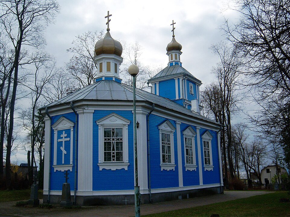 *The church in Panevėžys is a wooden, single-nave church. The entrance is through a vestibule, above which rises a bell tower topped with a bell tower and a gilded onion-shaped dome. A similar structure also stands over the chancel. The exterior of the building is painted blue, while the window frames and half-columns are white. Carved and painted Orthodox crosses are on the main door and the rear wall of the chancel. The interior features a single-row iconostasis and two neoclassical side kiots with icons (one of which contains a copy of the Surdeghaz Icon of the Mother of God). The walls of the building are decorated with more than a dozen smaller icons from the second half of the 20th century.