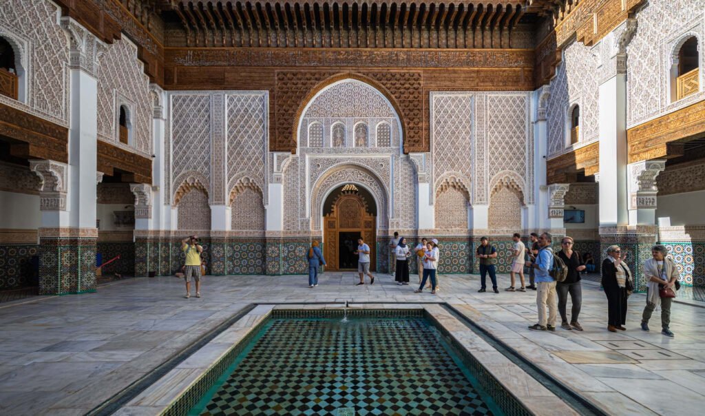 Madrasa Ben Youssef. A 14th-century Koranic school where you can admire the incredible Zellige mosaics. The craftsmanship, precision, hand-carved wood, and meticulously crafted decorative details are astounding. A beautiful, exceptionally aesthetic building, worth a visit when exploring the medina. Of course, it’s best to visit all the attractions as early as possible to avoid the crowds and the scorching sun. The school was built in 1565 and was the largest of its kind in the entire Maghreb (a geographical and cultural region in North Africa, encompassing the countries west of Egypt). The name comes from Arabic (“al-Maghrib” means “the west” or “the place where the sun sets”). Inside, you can admire the beautiful courtyard, and you can also visit and enter the prayer rooms and student rooms.