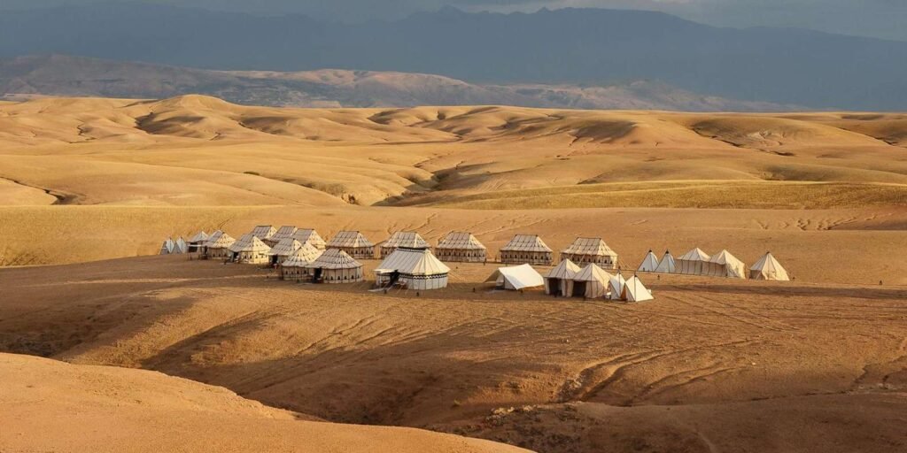 Agafay Desert, a tour with a local guide in Marrakesh. Besides exploring Marrakesh itself, we have the opportunity to explore the wonderful surroundings of the Red City. Our first trip was the Agafay Desert. This is a guided day trip, and the price includes pickup from your hotel, a desert trek, a camel ride, and a sunset dinner in the desert. Honestly, considering how much such a trip cost us—which was peanuts compared to, for example, entrance fees to some attractions in the city—we were incredibly pleasantly surprised by the entire trip. We booked the tour through Get Your Guide, which cost around €25 per person. In a small group, we set off on a small bus outside the city. Our first stop is a place where we learn a little about the local production of argan oil, a treasure and a product highly valued not only in Morocco but also around the world. After a short ride, we arrive in the desert, where camels await us. I always say that any animal-based activities are unethical, but in my opinion, camels are, in a way, like horses. They’ve been ridden for centuries, just like horses, and we make sure on-site that the camels are treated well, not exploited all day, etc. The guide assures us that each group only rides a fraction of the day, and the rides are relatively short. Honestly, despite the guide’s assurances, this wasn’t the best part of the entire trip for me. On the contrary, I thought it was the weakest part, because this isn’t the Sahara. Agafay is a rocky desert, rather unimpressive, and yet I always feel sorry for these animals, despite my willingness, sympathy, and belief in the ethical nature of the entire endeavor. The best part of the trip was what was to come. Dinner in the desert, in a traditional restaurant, on carpets as the sun set. It was magical and beautiful, and the food, as always, was delicious. When heading to the desert, remember to wear comfortable clothing, sun protection, and bring plenty of water.
