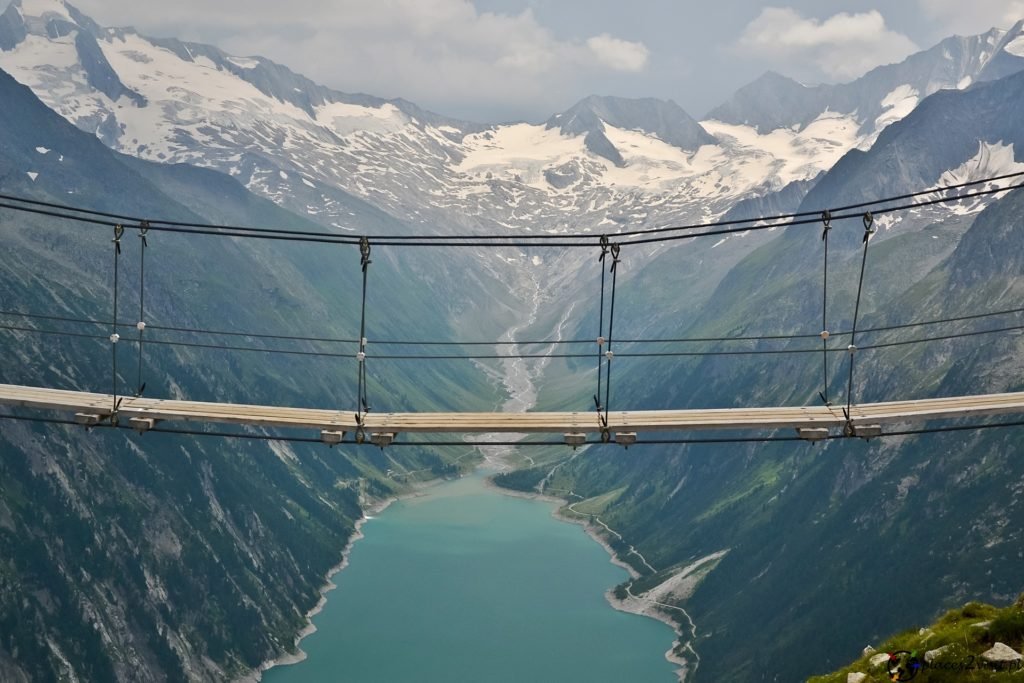 The suspension bridge near the Olpererhütte mountain hut is an extraordinary attraction located in the heart of the Zillertal Alps in Austria. This captivating suspension bridge is situated close to the Olpererhütte mountain hut, which serves as a popular recreational spot and starting point for hikes in the region.