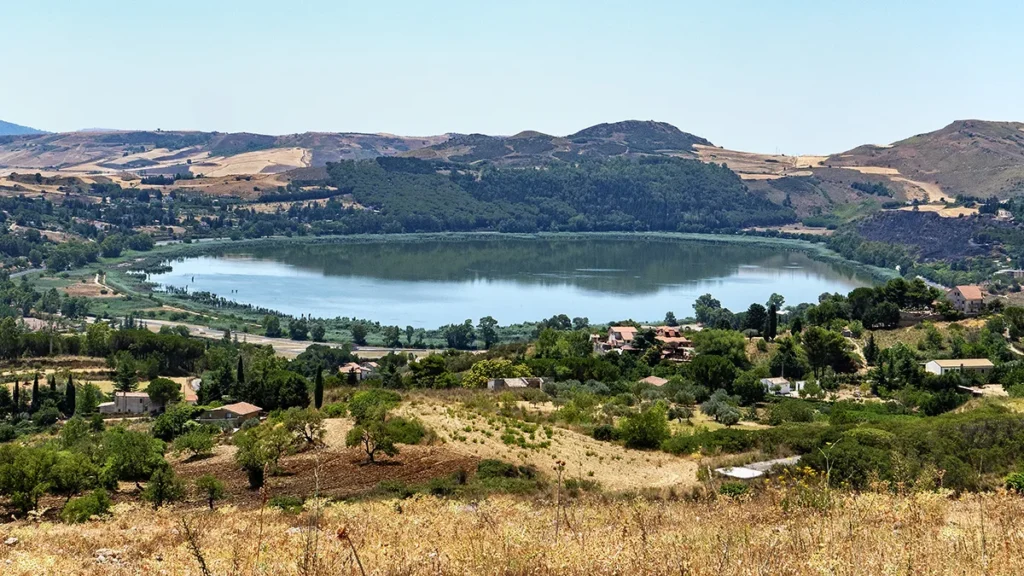 Lake Pergusa, the only natural lake in Sicily. Situated a few kilometers from Enna, this natural basin was a reference point for migratory fauna, in particular for numerous species of birds that stopped there on their way between Africa and Europe. Moreover, Lake Pergusa was known since antiquity and linked to numerous legends, such as that of the Rape of Proserpine.It’s a popular summer hang-out with a few compact beaches, big resort-style hotels and an unlikely motor-racing circuit, but out of season it’s a rather forlorn place.