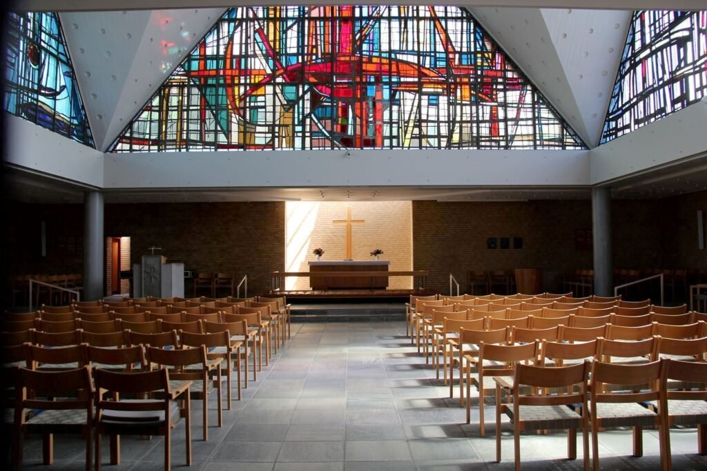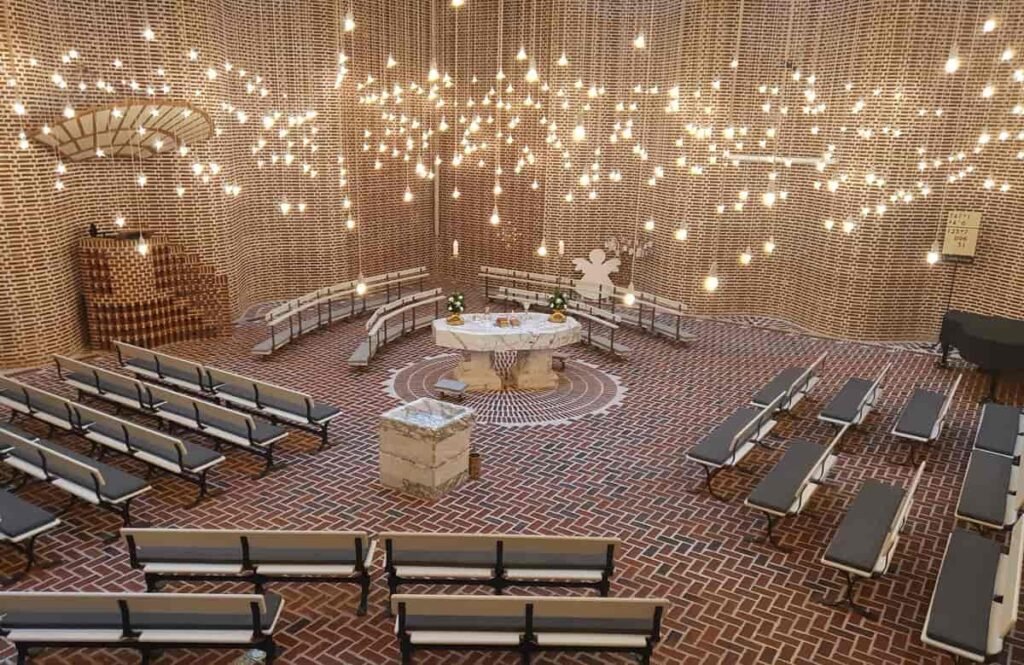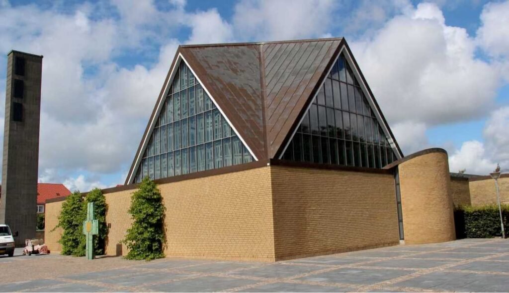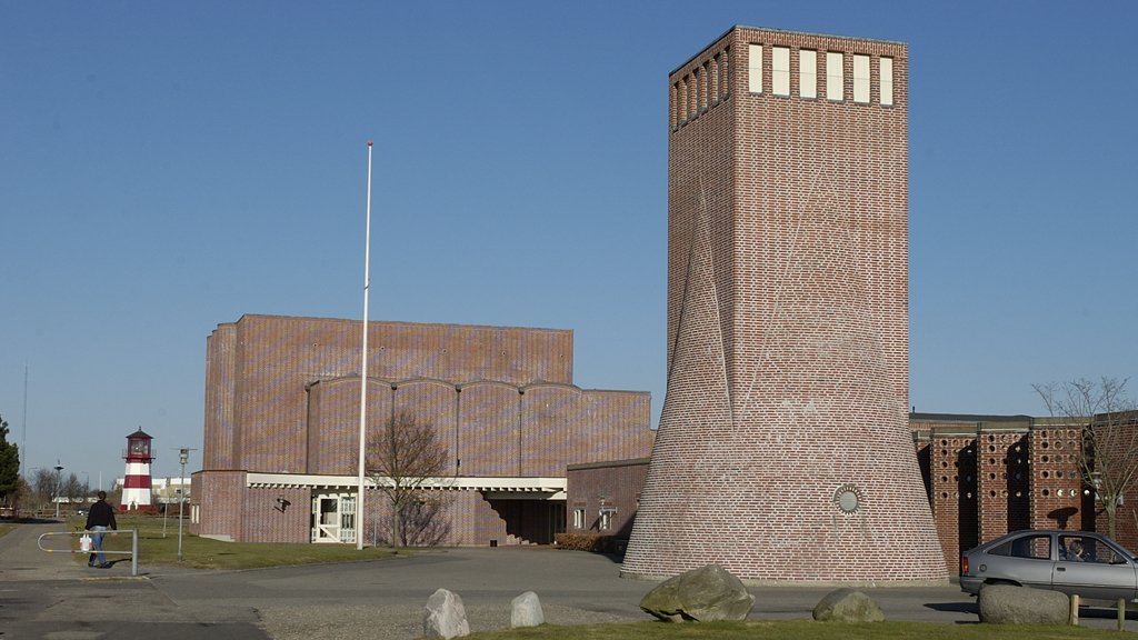 Sædden Church is a Church of Denmark church in Esbjerg and was completed and consecrated in 1978. Located in the Sædding neighbourhood northwest of Esbjerg’s centre, the church is built entirely of red brick, with wave-shaped folds on the north and east walls. There are galleries on the other two walls. The complex also consists of parish rooms and administrative offices. The free-standing tower is strangely shaped with a round base and a square top.