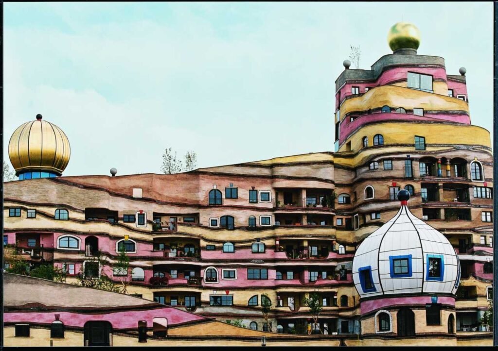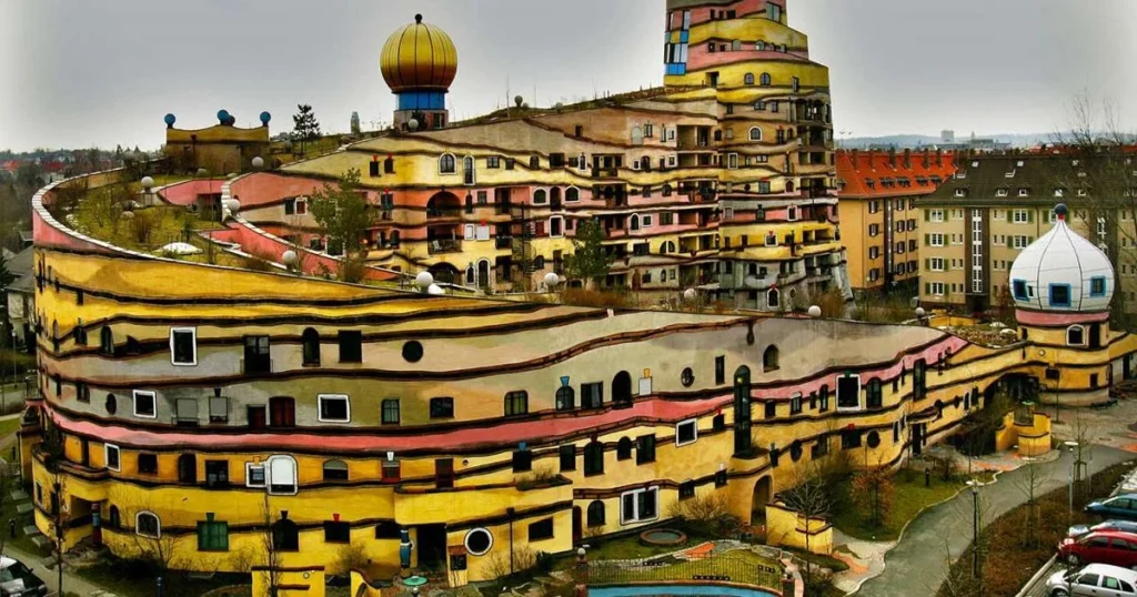 Waldspirale is a large spiral housing complex with 105 apartments in the Bürgerpark district of Darmstadt. The official opening took place in 2000, and its construction dates back to the 1990s. The building stands out from others with a unique facade without a regular pattern and windows that give the impression of “dancing outside the line”. On the roof, covered with grass, shrubs, flowers and trees, there is a unique garden that spirals upwards, reaching 12 stories at its highest point. The complex also has an underground garage.
