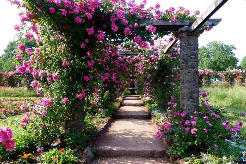 The park’s creation dates back to 1817. The centerpiece is the rosarium with the rose dome. More than 10,000 roses in over 200 species and varieties bloom from May to November. There are also modern perennial plantings, summer flowers and some exotic trees. Spacious meadows, well-developed paths and benches make the park an oasis of peace. Interesting buildings, such as the mausoleums of the royal family, the tea house and the gatehouse, are also worth a visit.