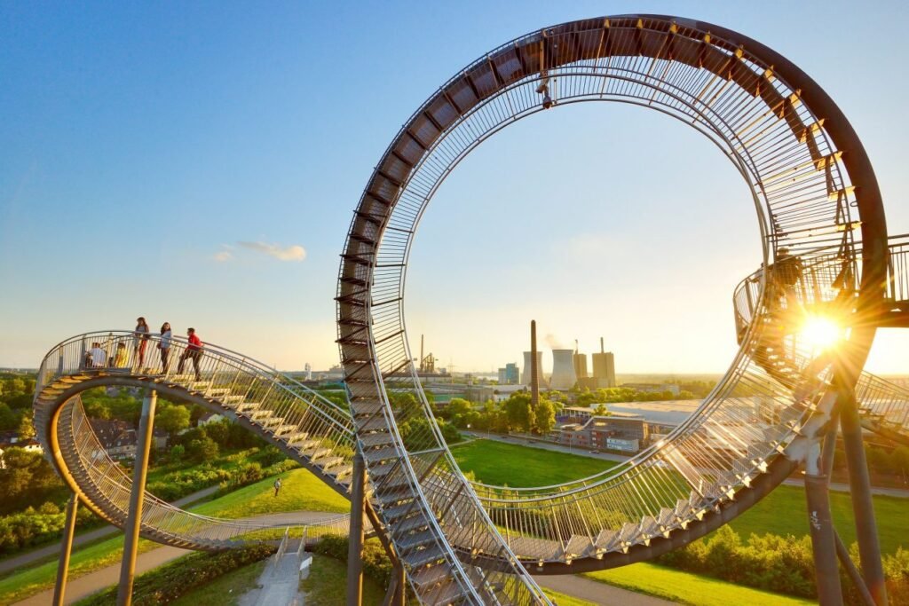 Metal structure shining in the sun, from a distance it looks like a roller coaster, but in fact it is an observation tower. The landmark is visible from a distance and was built on the site of a former slag heap south of Duisburg. Anyone who climbs the stairs to the loop will be rewarded with a great view. In good weather you can see the view from the center of Duisburg along the Rhine to Düsseldorf. Around the structure you can see the bustling activity of various steel mills and Logport’s huge warehouse areas, but also dense forests.