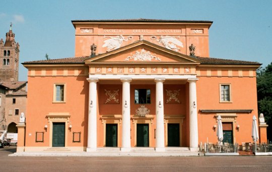 Inaugurated in 1861, the Municipal Theatre in Carpi is an excellent example of an Italian style theatre: a horseshoeshaped auditorium continues up the walls with three circles of boxes and a gallery. Including the stalls it offers almost 600 seats. It was a “Society of Box Owners” that entrusted the architect Cesare Costa with the task of erecting a new theatre on the impressive main square, the Piazza dei Martiri.