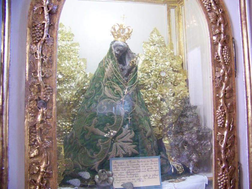 *History, legend. The first settlements were Pederneira and Sítio, above the beach. These provided residents with a relatively safe haven from raids by Algerian, French, English, and Dutch pirates, which lasted until the early 19th century. According to legend, the town derives its name from a small statue of the Virgin Mary, the Black Madonna, brought by a monk from Nazareth in the 4th century to a monastery near Mérida. It was brought to Nazaré in 711 by the monk Romano, accompanied by Roderic, king of the Visigoths. Upon arriving at the seaside, the monk became a hermit. He lived and died in a small, natural grotto at the top of a cliff. After his death, and in accordance with the monk’s wishes, the king buried him in the grotto and left the statue on an altar. The first church was built over the grotto in memory of the miraculous saving of the life of the Portuguese knight Dom Fuas Roupinho (presumably a Templar) by the Virgin Mary. According to legend, in the early morning of September 14, 1182, Dom Fuas Roupinho was hunting near the coast when he saw a deer, which he immediately began chasing. The deer ran toward the top of the cliff, where a thick sea fog lay. The knight realized he was at the edge of a cliff, not far from the grotto with the statue, and began to pray. Unexpectedly, the horse miraculously stopped at the end of the cliff, thus saving the rider from a fall of over 100 meters, which would certainly have resulted in his death. To commemorate the miracle, he built a chapel (Capela da Memoria) on the grotto, where the miraculous statue had been left by Roderic after the monk’s death. In 1377, King Ferdinand I of Portugal built a larger church, which was completely rebuilt between the 14th and 19th centuries. Today, the Church of Our Lady of Nazaré is a lavish Baroque structure, with an interior decorated with azulejo tiles. Behind the altar, visitors can see and venerate the miraculous statue of Our Lady of Nazaré.