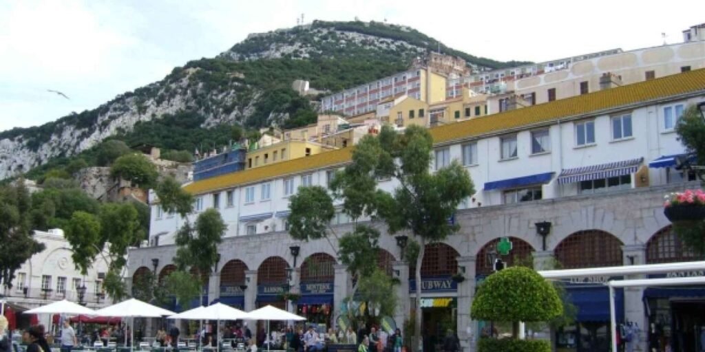 Gibraltar is a British overseas territory on the southern coast of the Iberian Peninsula, in Southern Europe. It covers an area of 6.55 km² and has a population of 34,003. It is located on the Bay of Gibraltar, near the Mediterranean Sea’s exit to the Atlantic Ocean (the Strait of Gibraltar). To the north, it borders the Spanish city of La Línea de la Concepción and the comarca of Campo de Gibraltar. The Rock of Gibraltar dominates the territory. Formerly an important Royal Navy base, the territory’s economy now relies primarily on tourism, trade, financial services, the maritime sector, and a tax on bookmaking.